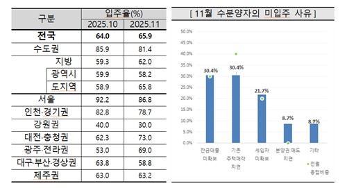 인천·경기권은 78.7%로 10월(82.8%)보다 4.1%p 하락했다. 10·15 대책으로 서울 전 지역과 경기 일부 지역이 토지거래허가구역 등으로 묶이며 실수요자 입주 의무와 잔금 대출 제한이 강화됐기 때문이다.