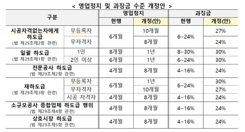 불법하도급 처분 수준도 강화했다. 기존엔 불법하도급을 한 자에게 4~8개월까지 영업정지 처분을 할 수 있었지만, 앞으로 최소 8개월~최대 1년으로 기간이 늘어난다.