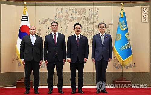 오른쪽부터 조현 외교부 장관, 이재명 대통령, 하젬 자키 대사, 오마르 압델라 참사관. 2025.12.11 superdoo82@yna.co.kr