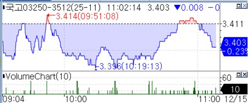 국고채 10년 지표물인 25-11호는 전 거래일 대비 0.6bp 하락한 3.405%로 개장했다.