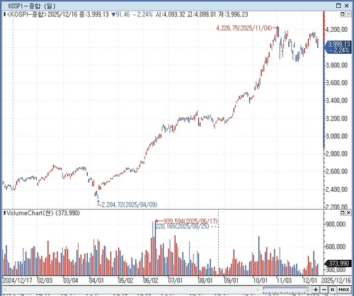 인공지능(AI)발 반도체 훈풍과 새 정부의 자본시장 개혁에 힘입어 치솟은 코스피는 주요국 주식시장 중에서도 손에 꼽을 랠리를 펼치며 4,000선을 돌파했고, 지난 11월 3일(4,221)에 종가 기준으로 사상 최고치 기록을 세웠다.