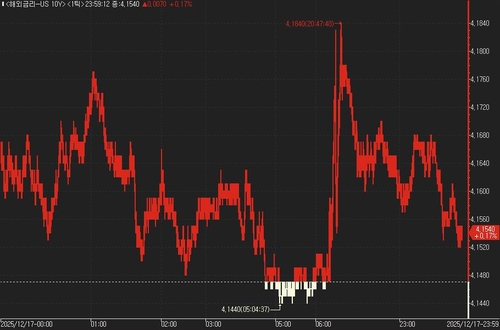 연합인포맥스의 해외금리 일중 화면(화면번호 6532)에 따르면 17일(미국 동부시간) 오전 9시 11분 현재 뉴욕 채권시장에서 10년물 국채금리는 직전 거래일 오후 3시 기준가보다 1.60bp 오른 4.164%를 기록했다.