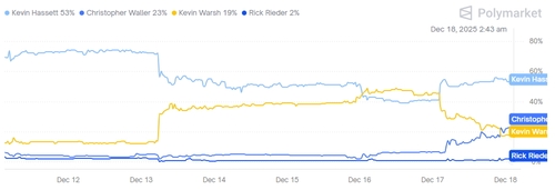 폴리마켓에서 케빈 해싯 백악관 국가경제위원회(NEC) 위원장은 53%의 확률로 1위를 달리고 있다. 해싯 위원장에 대한 부정적 보도가 최근 잇달아 나오면서 2위로 잠시 처지기도 했으나 1위를 되찾은 것이다.