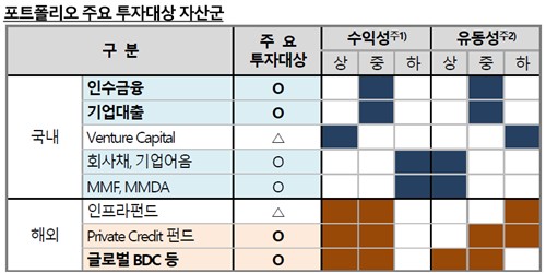 자산군별로 상이한 금리와 신용, 지역 리스크 특성이 있는 만큼, 상호보완적으로 배분해 안정적인 수익을 창출하겠다는 구상이다.