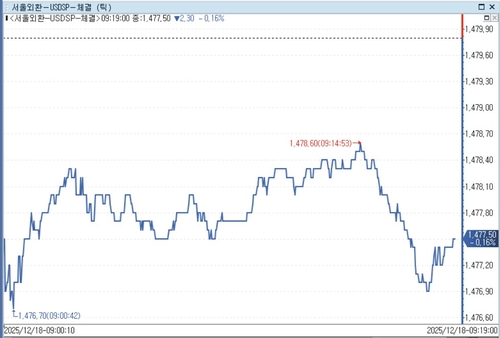 18일 서울 외환시장에서 달러-원 환율은 오전 9시 22분 현재 전장대비 2.10원 내린 1,477.70원에 거래됐다.