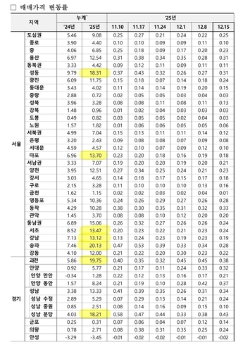 자치구별로 보면 송파구가 20.13% 오르며 1위를 나타냈고 성동구가 18.31%, 마포구가 13.70%, 서초구가 13.47%, 강남구가 13.12%로 뒤를 이었다. 경기도에서는 과천이 19.75% 상승했고 성남시 분당구도 18.21% 올랐다.