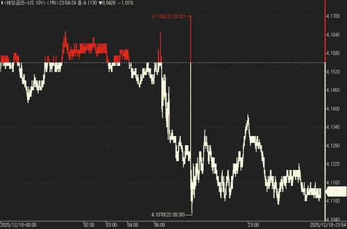 연합인포맥스의 해외금리 일중 화면(화면번호 6532)에 따르면 18일(미국 동부시간) 오전 9시 27분 현재 뉴욕 채권시장에서 10년물 국채금리는 직전 거래일 오후 3시 기준가보다 3.10bp 하락한 4.119%를 기록했다.