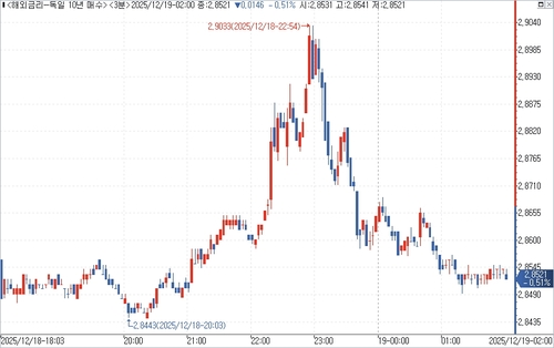 연합인포맥스의 해외금리(화면번호 6538번)에 따르면 유로존 채권시장의 벤치마크 역할을 하는 독일 국채(분트) 10년물 수익률은 이날 2.8521%로 전장대비 1.88bp 낮아졌다.