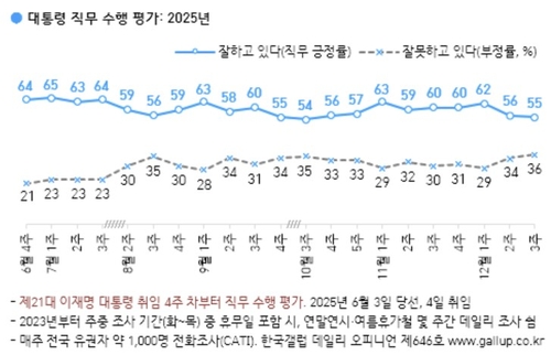 한국갤럽이 지난 16~18일 전국 만 18세 이상 유권자 1천1명을 대상으로 이 대통령이 현재 대통령으로서의 직무를 잘 수행하고 있다고 보는지 물은 결과 '잘하고 있다'는 긍정 평가는 55%로 직전 조사 대비 1%포인트(p) 내렸다.