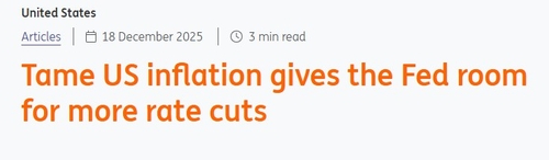 (서울=연합인포맥스) 권용욱 기자 = ING은행은 미국 11월 소비자물가지수(CPI)와 관련, "정부 셧다운(일시적 업무 정지) 영향 때문에 (신뢰도에) 회의적인 시각도 있지만, 추가적인 금리 인하 여지를 부여한다"고 평가했다.